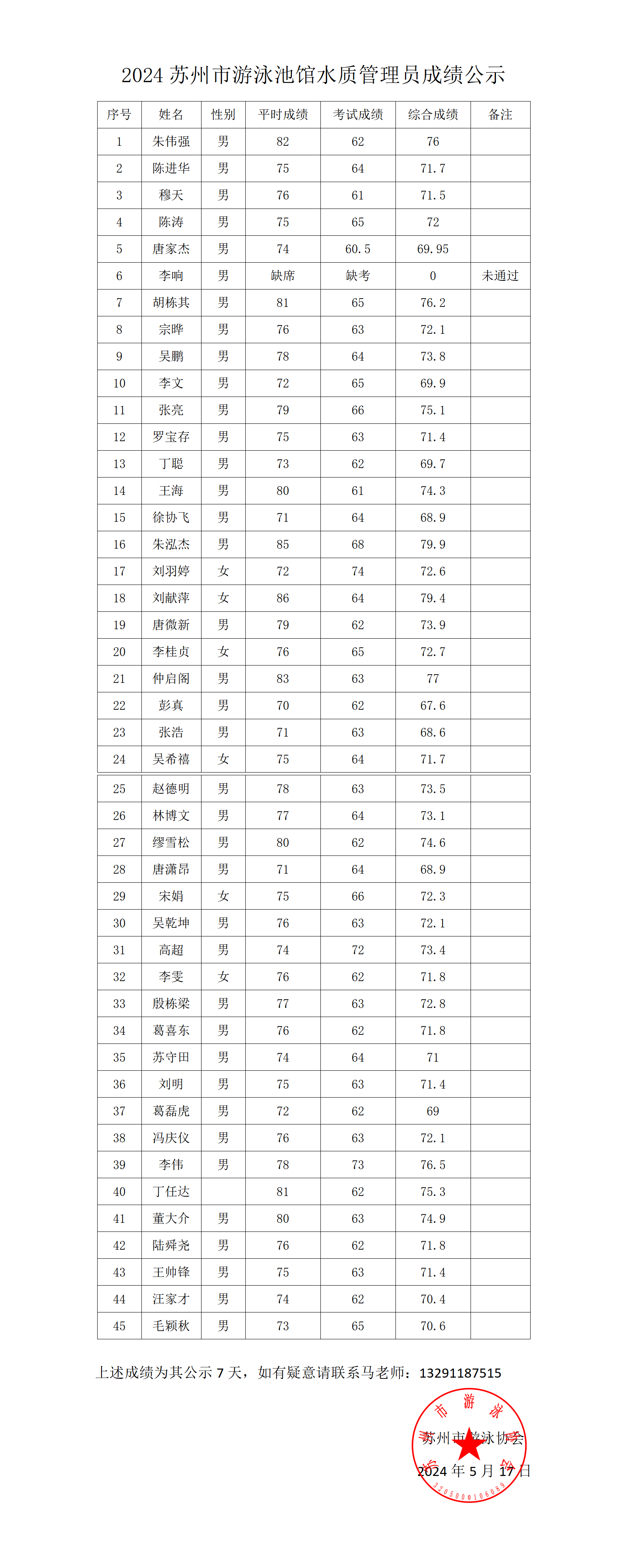 2024苏州市游泳池馆水质管理员成绩公示