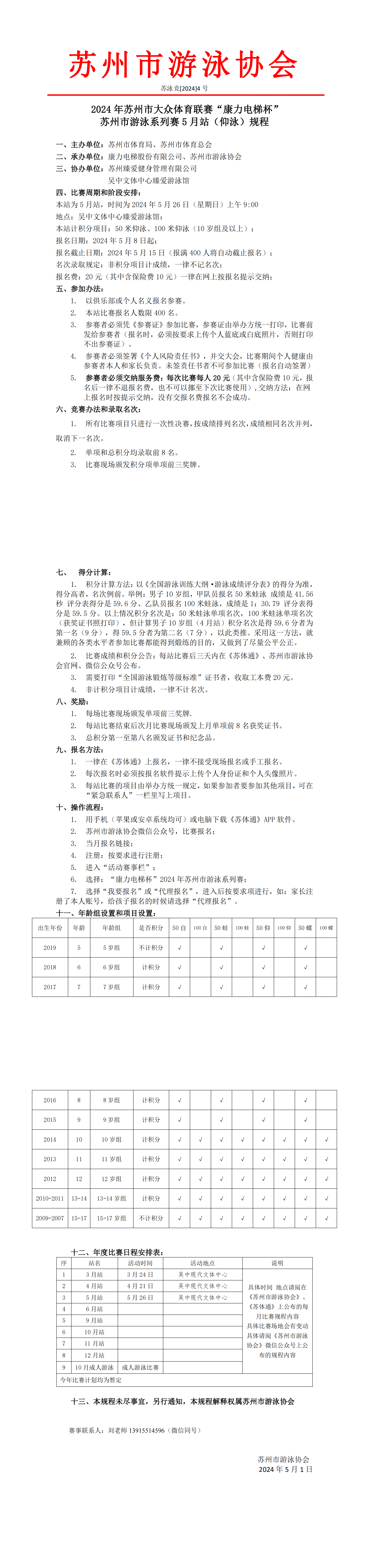2024年苏州市大众体育联赛“康力电梯杯”苏州市游泳系列赛5月站(仰泳)规程