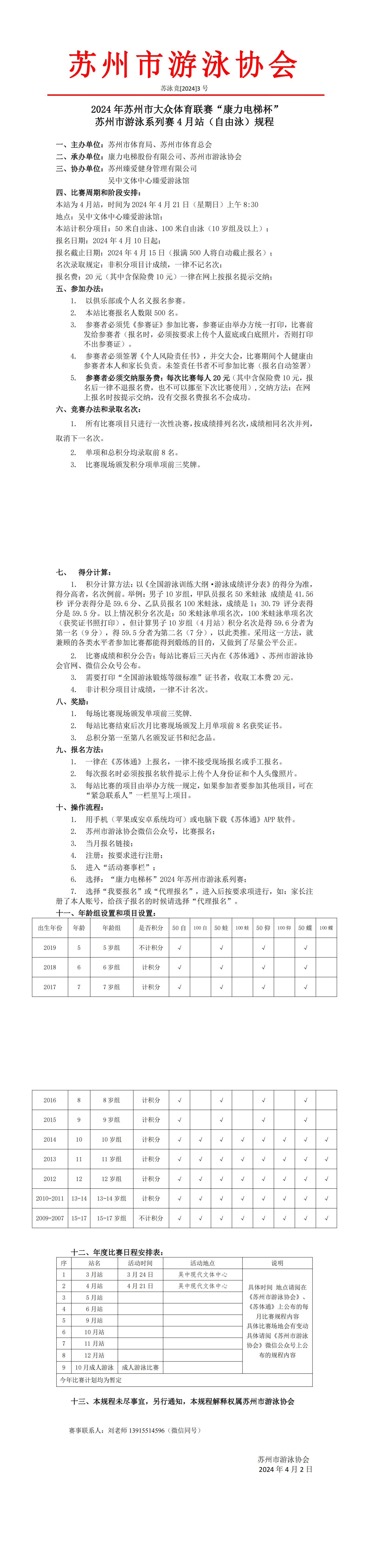 2024年苏州市大众体育联赛“康力电梯杯”苏州市游泳系列赛4月站(自由泳)规程