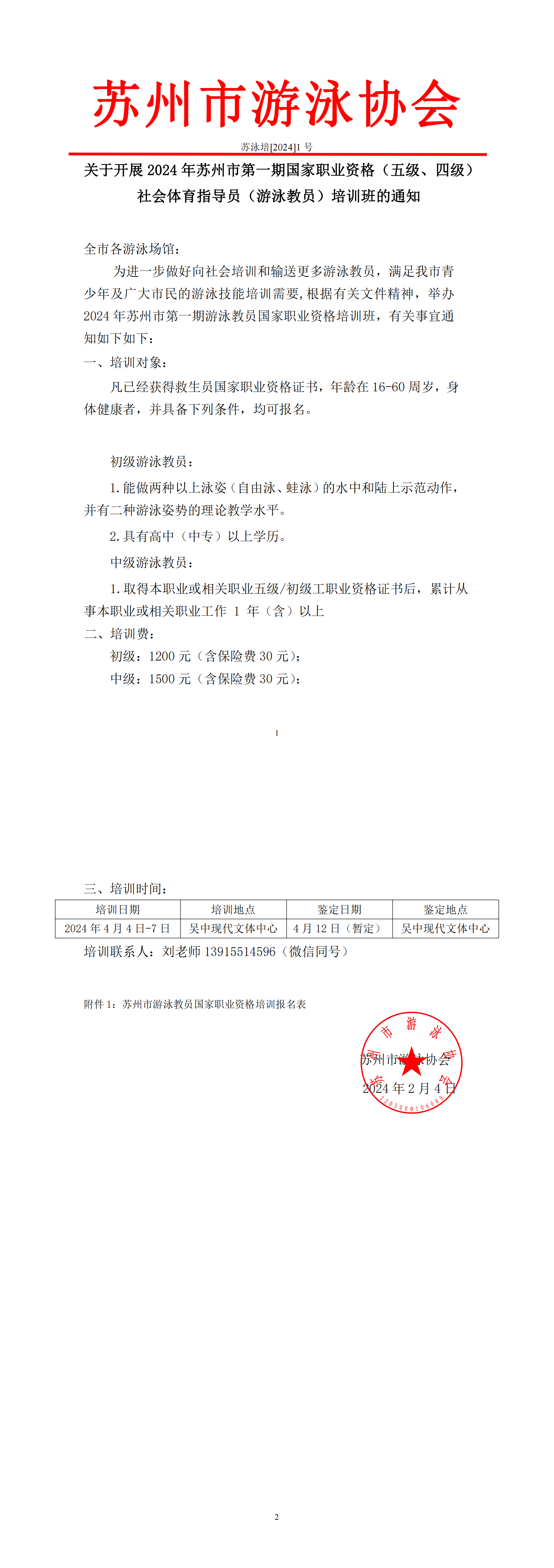 关于开展2024年苏州市第一期国家职业资格(五级、四级)社会体育指导员(游泳教员)培训班的通知