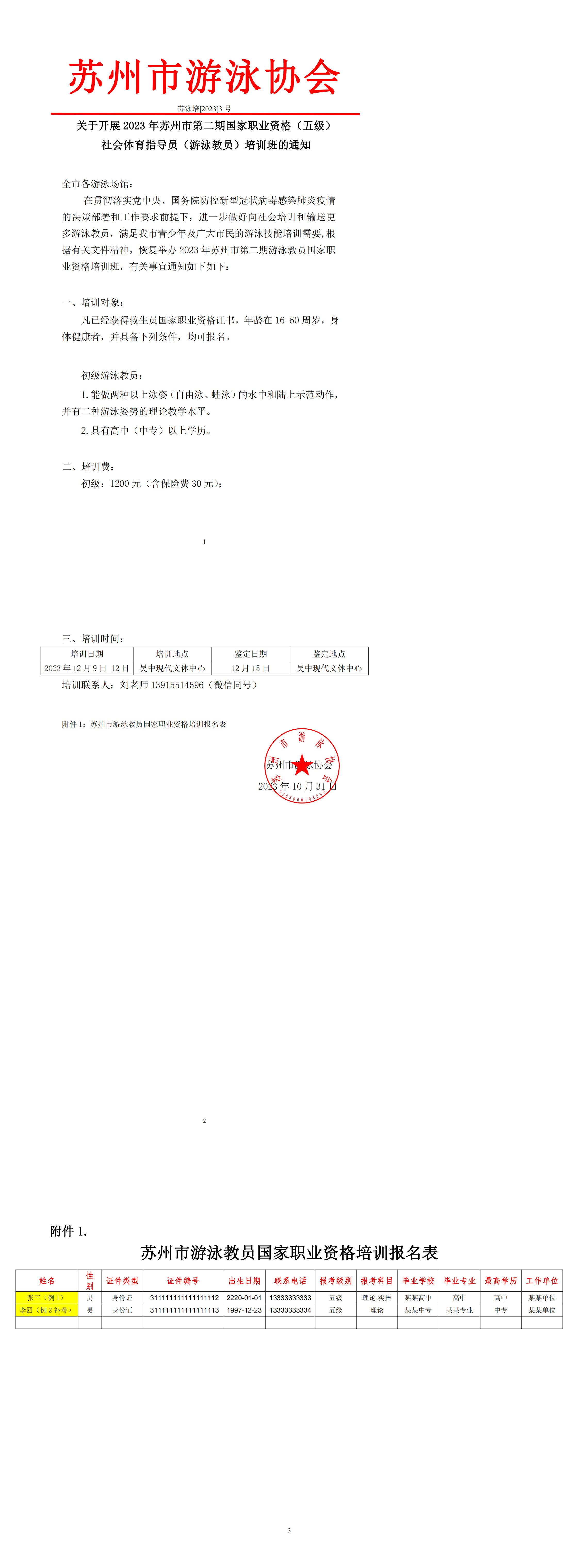 关于开展2023年苏州市第二期国家职业资格(五级)社会体育指导员(游泳教员)培训班的通知