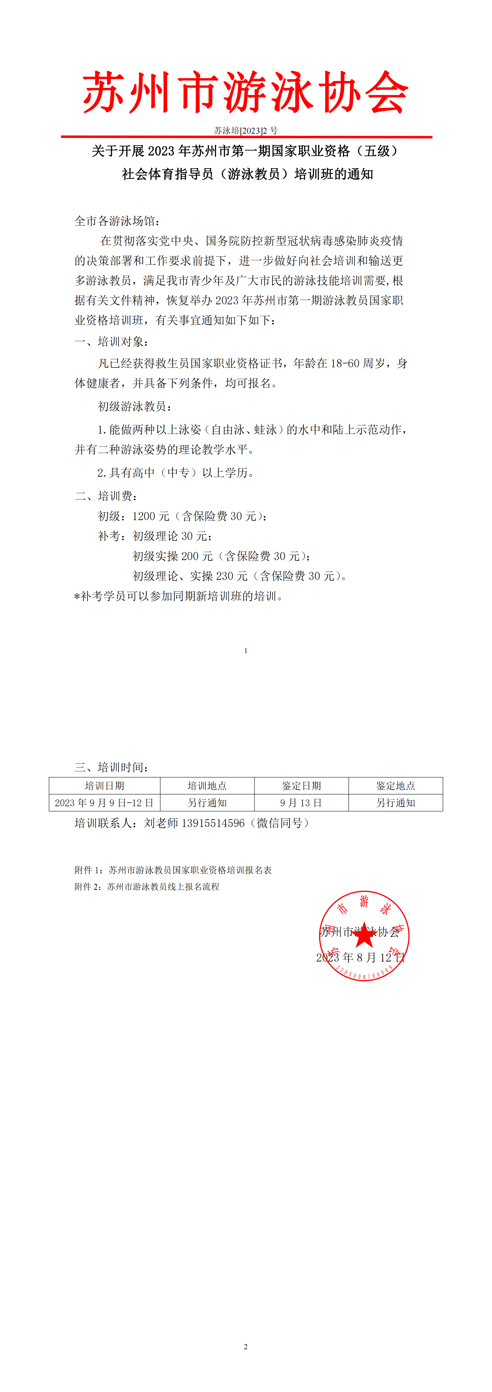 关于开展2023年苏州市第一期国家职业资格(五级)社会体育指导员(游泳教员)培训班的通知