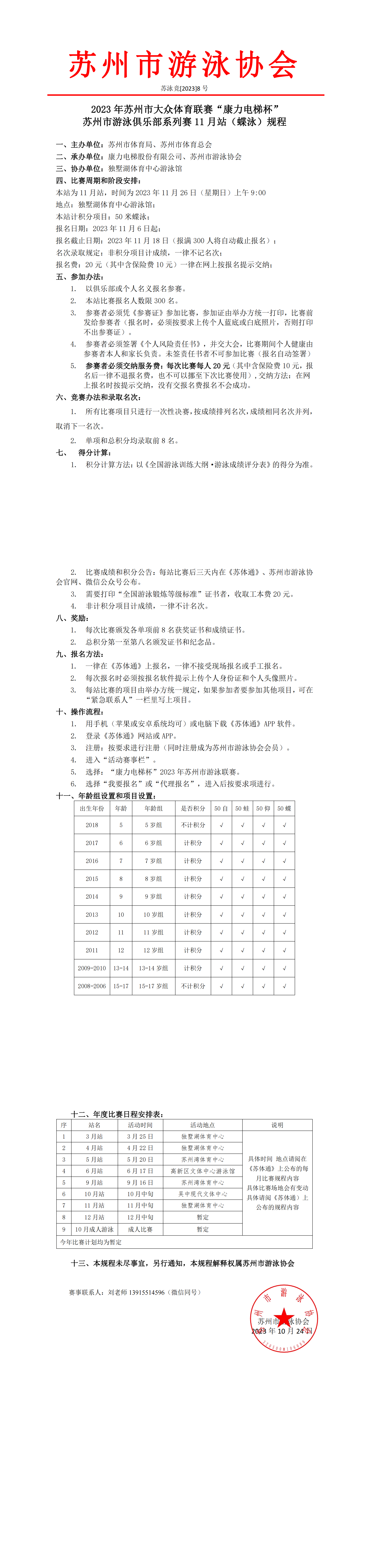 2023年苏州市大众体育联赛“康力电梯杯”苏州市游泳俱乐部系列赛11月站(蝶泳)规程