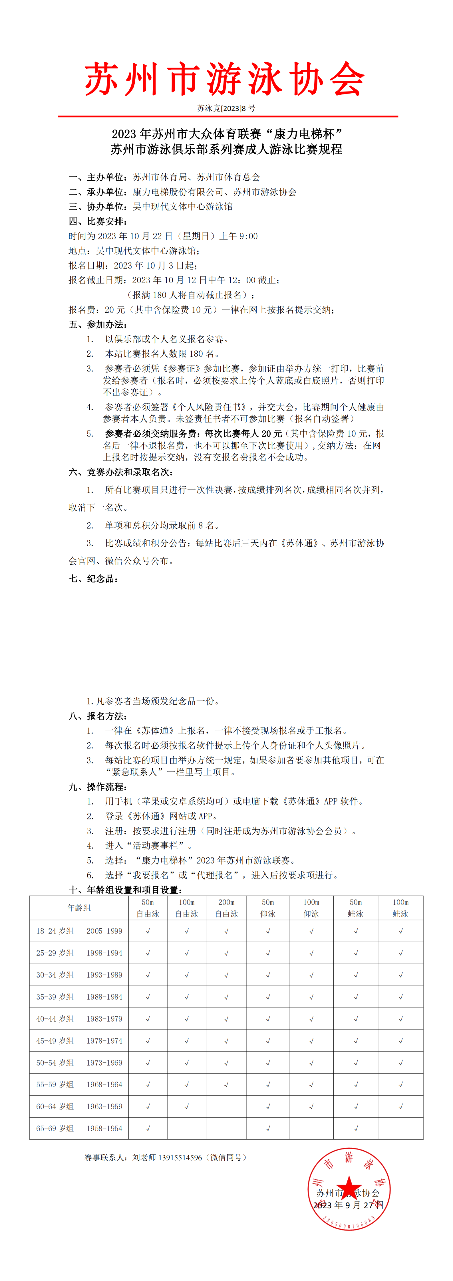 2023年苏州市大众体育联赛“康力电梯杯”苏州市游泳俱乐部系列赛成人游泳比赛规程