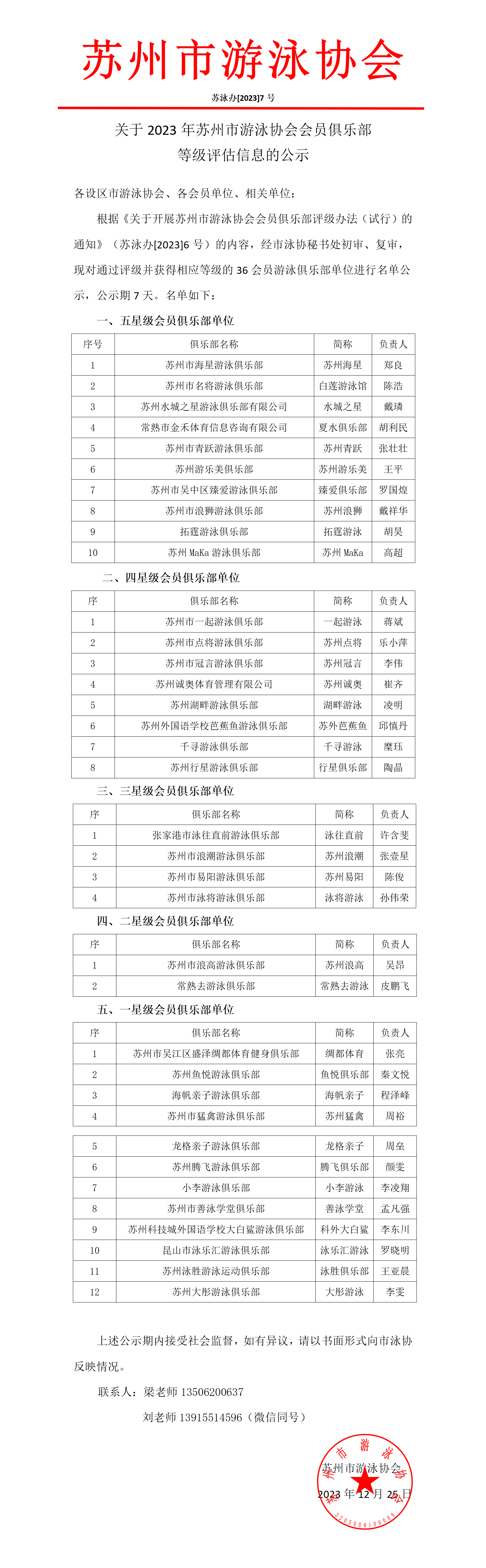 关于2023年苏州市游泳协会会员俱乐部等级评估信息的公示